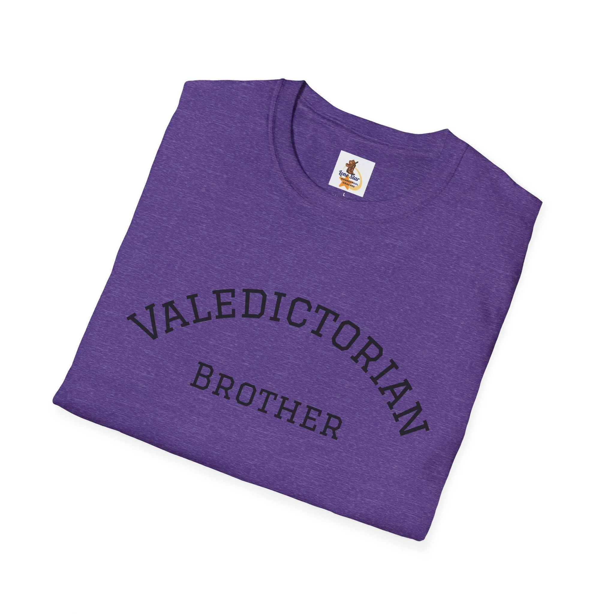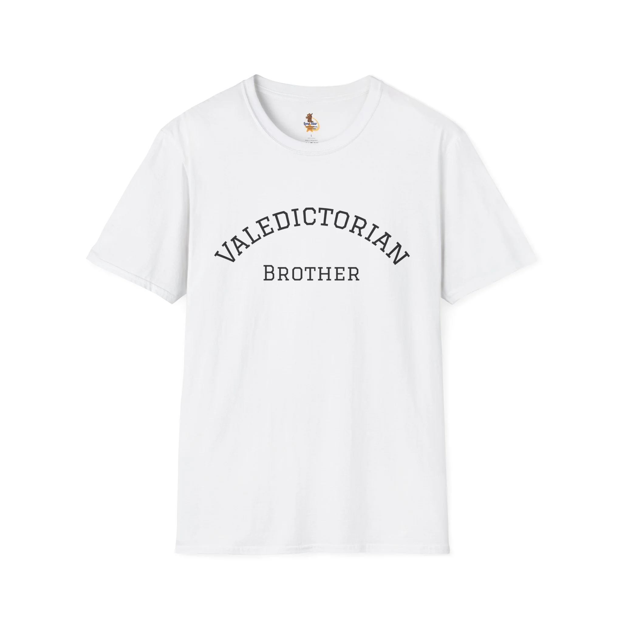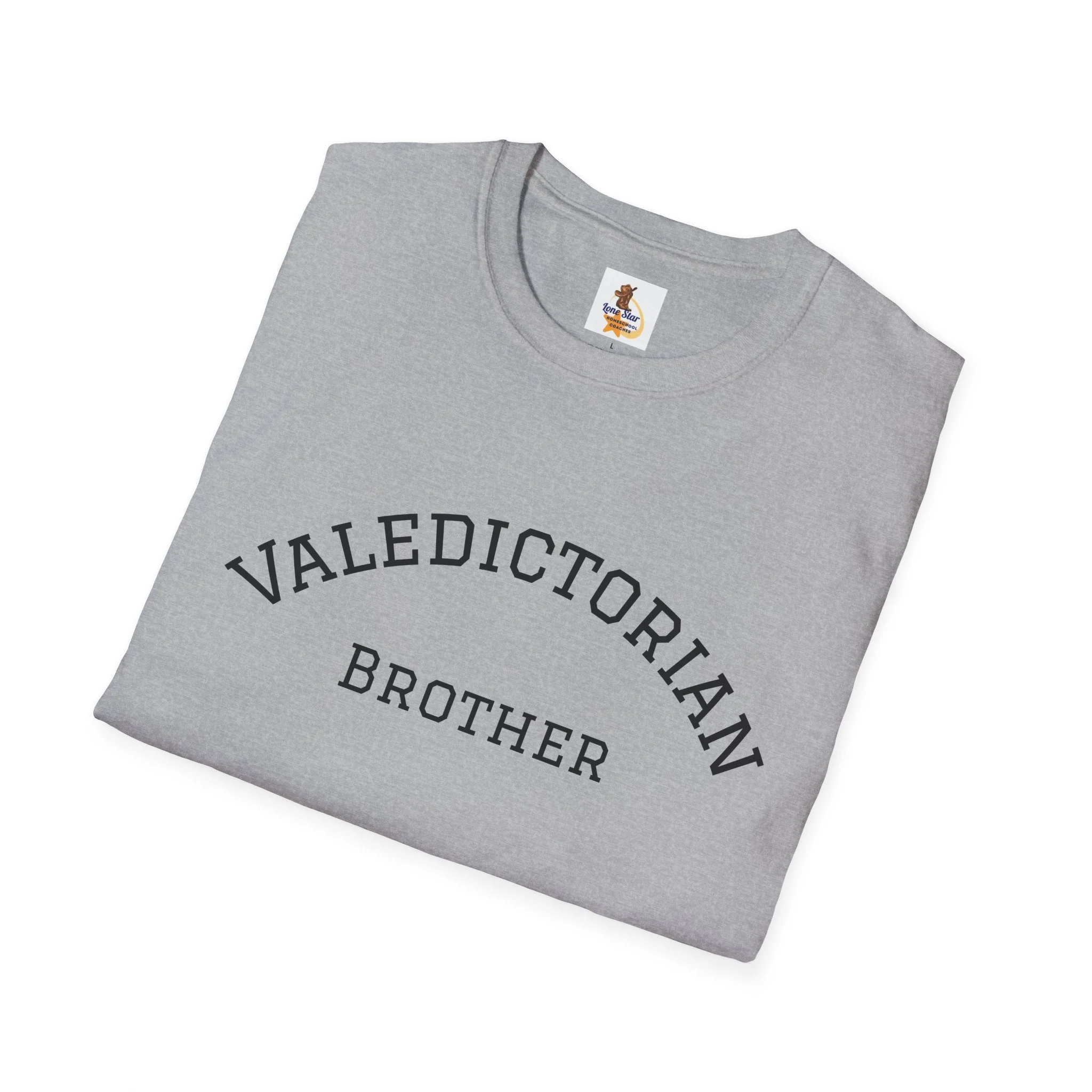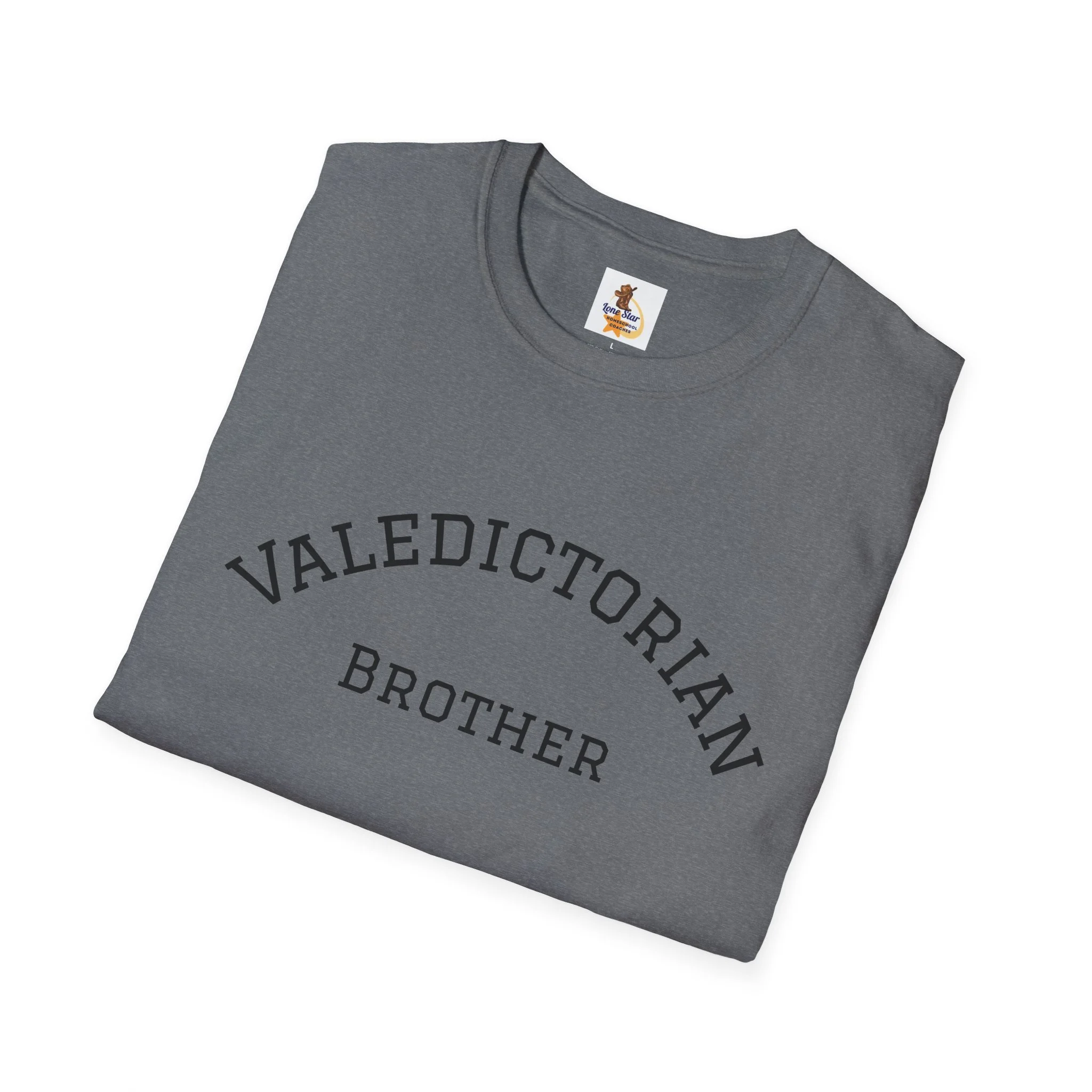 A clean, vintage-inspired tee that quietly celebrates a big moment. The soft, slightly worn lettering reads “VALEDICTORIAN / Brother,” like a varsity arch pulled from an old yearbook. Lightweight ring-spun cotton drapes easily over the shoulders. It feels lived-in from the first wear — calm, confident, and a little nostalgic. Wear it to low-key graduation gatherings, photos with family, or on the drive home after the ceremony. Layer it under a jacket for cooler weather or pair with jeans and sneakers for an easy, respectful look that puts the achievement front and center without shouting. This shirt suits siblings who want to honor a graduate with warmth and subtlety, keeping the focus on the shared moment rather than flashy branding.